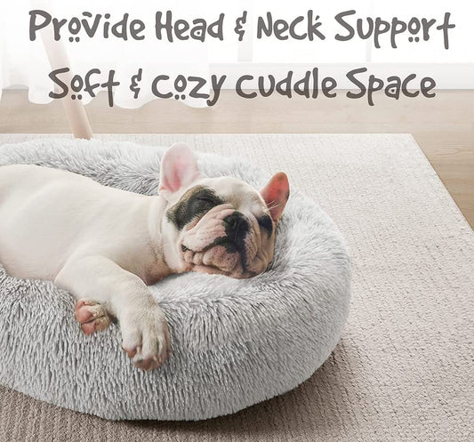 Donut Dog Bed Faux Fur Fluffy Calming Sofa for Small Dogs, Soft & Plush anti Anxiety Pet Couch for Dogs, Machine Washable Coco Pet Bed with Non-Slip Bottom, 23"X23"X6" Grey